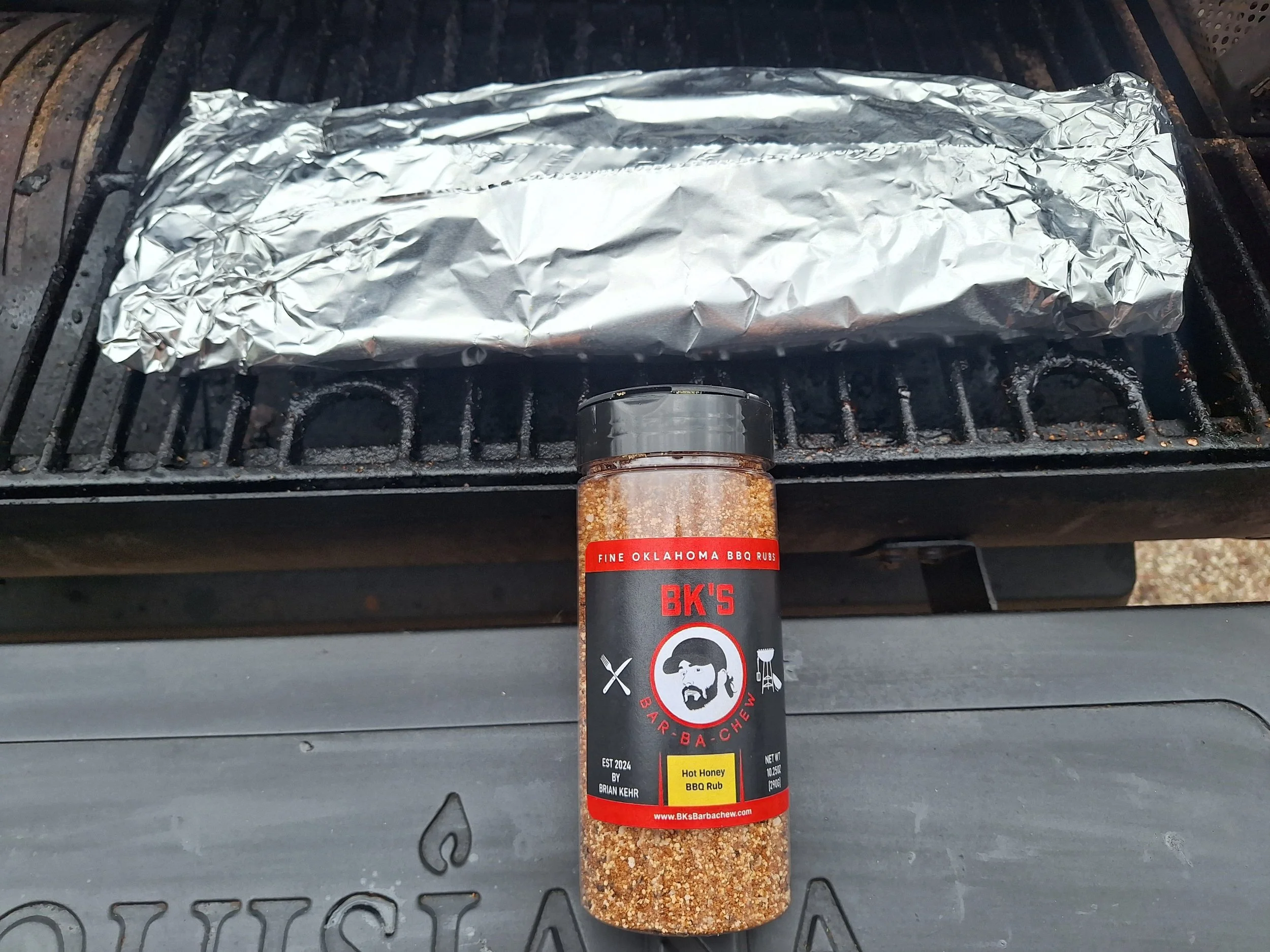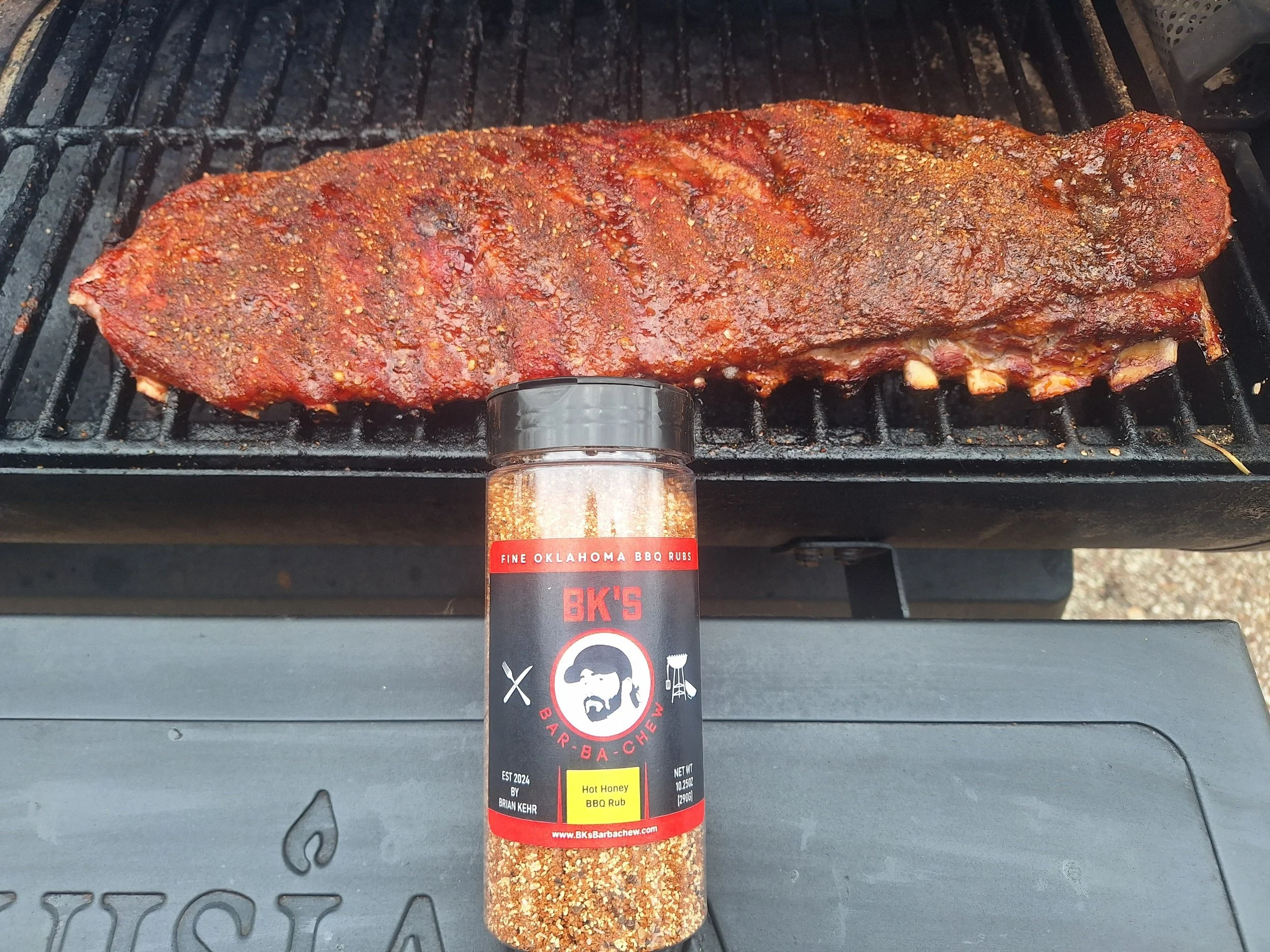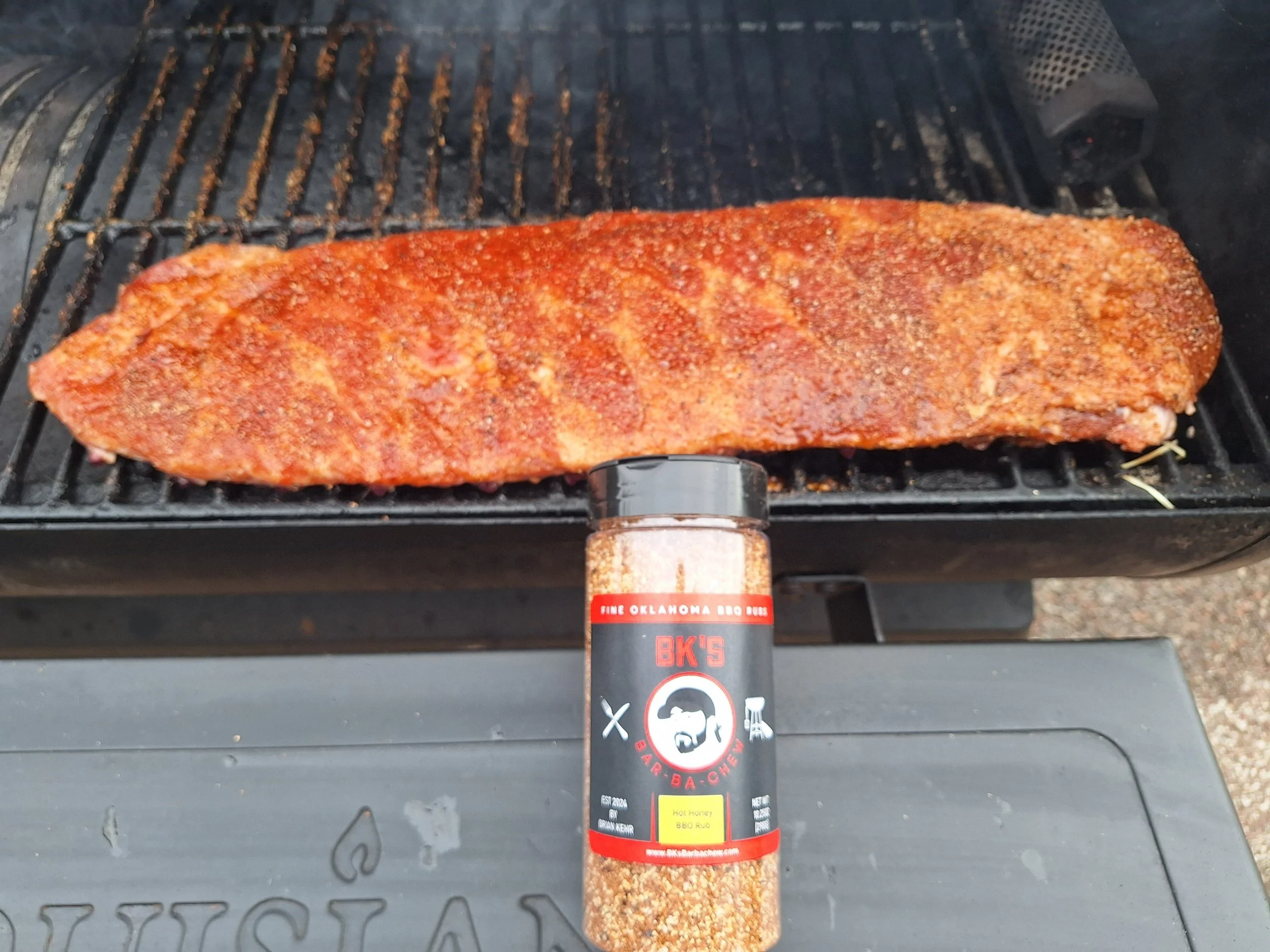 Season ribs with BK’s Bar-Ba-Chew’s Hot Honey BBQ Rub on all sides and all to set for at least 1-2 hours. This will allow the salt in the rub to draw some moisture out of the ribs, which helps in developing a better finished bark.!